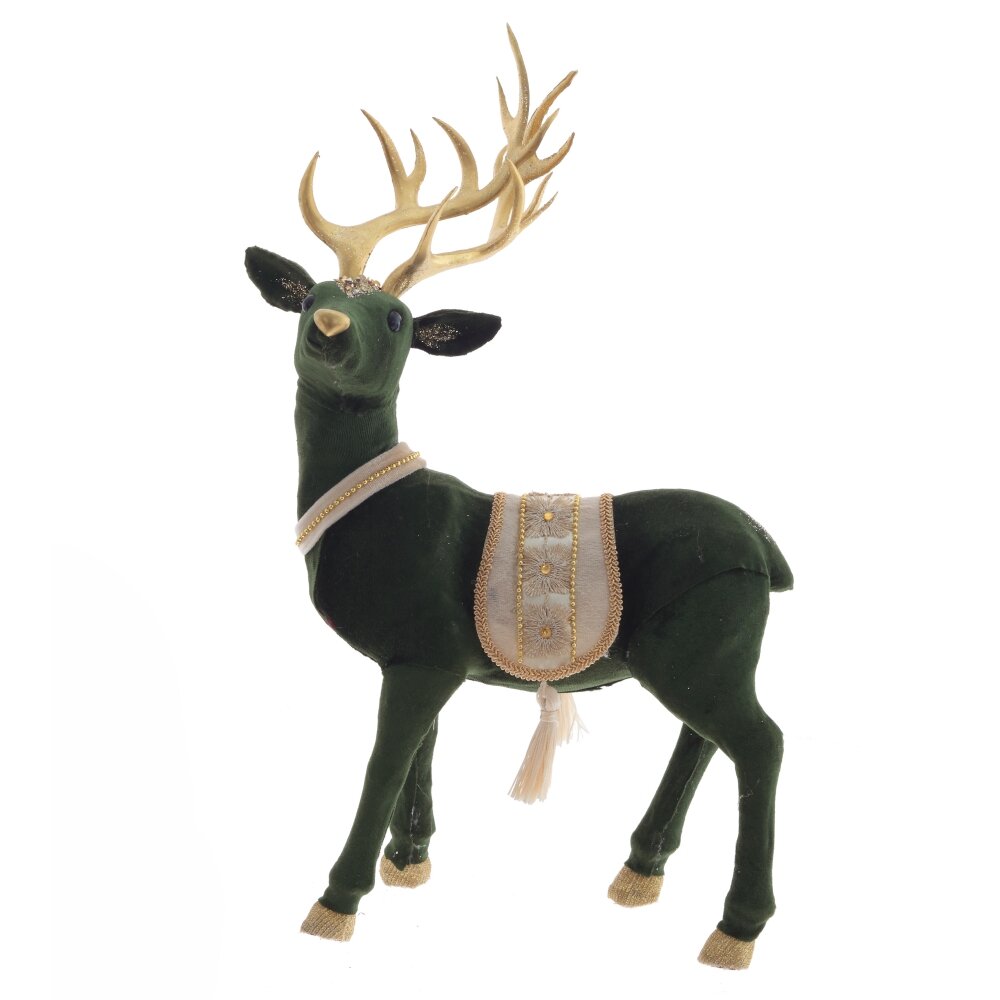 Приглашаю вас в мир зимнего волшебства с декоративной фигурой оленя в роскошной позолоченной сбруе. Взгляд животного исполнен мудрости и величия, а мощные золотые рога подчеркивают благородство существа. Тело оленя темно-зеленого цвета, выполненное из полимерных материалов и текстиля, создает ощущение реальности и приближает животное к природе.