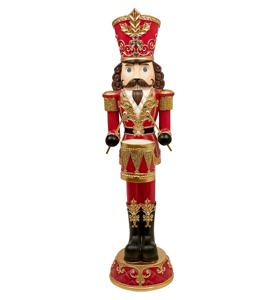 Продолжите новогоднюю сказку с огромной фигурой Щелкунчика, который с нетерпением ожидает услышать аплодисменты. В красном мундире с золотой оторочкой, с барабаном на груди и палочками в руках, он приглашает окунуться в мир музыки и танца. Рост Щелкунчика — 122 см, что позволяет установить его на видное место, превращая в главный элемент вашего новогоднего декора.
