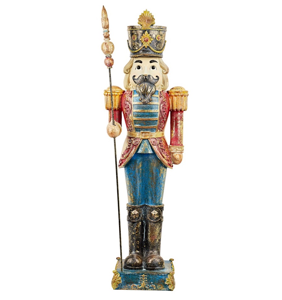 Шагните в мир древней сказки с мощным и харизматичным Щелкунчиком, готовым защитить вас от злых чар. Герой, облаченный в красно-синие военные регалии с золотым шитьем, спокойно стоит на постаменте, крепко сжимая в руке волшебный посох. Поверхность фигуры намеренно состарена, придавая ей вид древнего артефакта. Щелкунчик высотой 99 см станет символом защиты и доброго волшебства в вашем доме, зажигая праздничное настроение.