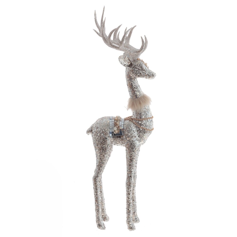 Пропитайте свой дом атмосферой сказки с декоративной фигурой гордого золотистый оленя с блестящими рогами. Эта статная фигура высотой 54 см одета в блестки, придавая ей мистическую элегантность и изысканность. Олень, выполненный из полимерных материалов и текстиля, станет ярким украшением вашего интерьера, символизируя силу, честь и достоинство. Серебристые рога добавят образу благородства и великолепия, наполняя пространство праздничным настроением.
