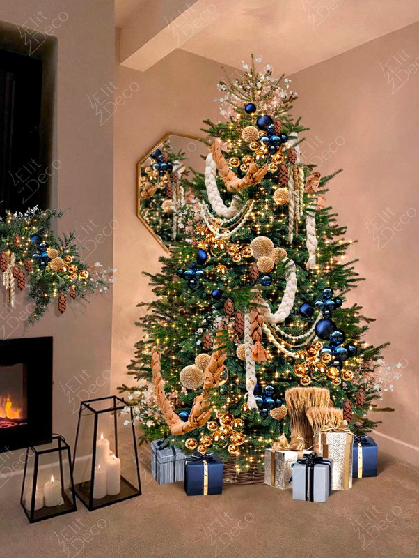 Ёлка украшена гирляндами из тканевых кос светло-коричневого и белого цветов, напоминающих кружевные узоры. Махровые светло-коричневые шары, синие сферы, золотые элементы и светящиеся веточки создают ощущение зимней сказки, наполненной волшебством и теплом. Можно украсить интерьер фигурами. На камин, дверь или окно можно повесить рождественские гирлянды и венки.