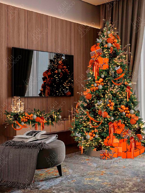 Во власти яркого тепла и роскоши с дизайнерской елью «Жар-птица Нового года». Удивительный проект в солнечных оранжевых, глубоких коричневых, роскошных золотистых и ледяных серебристых оттенках подарит вашему дому праздничное настроение.