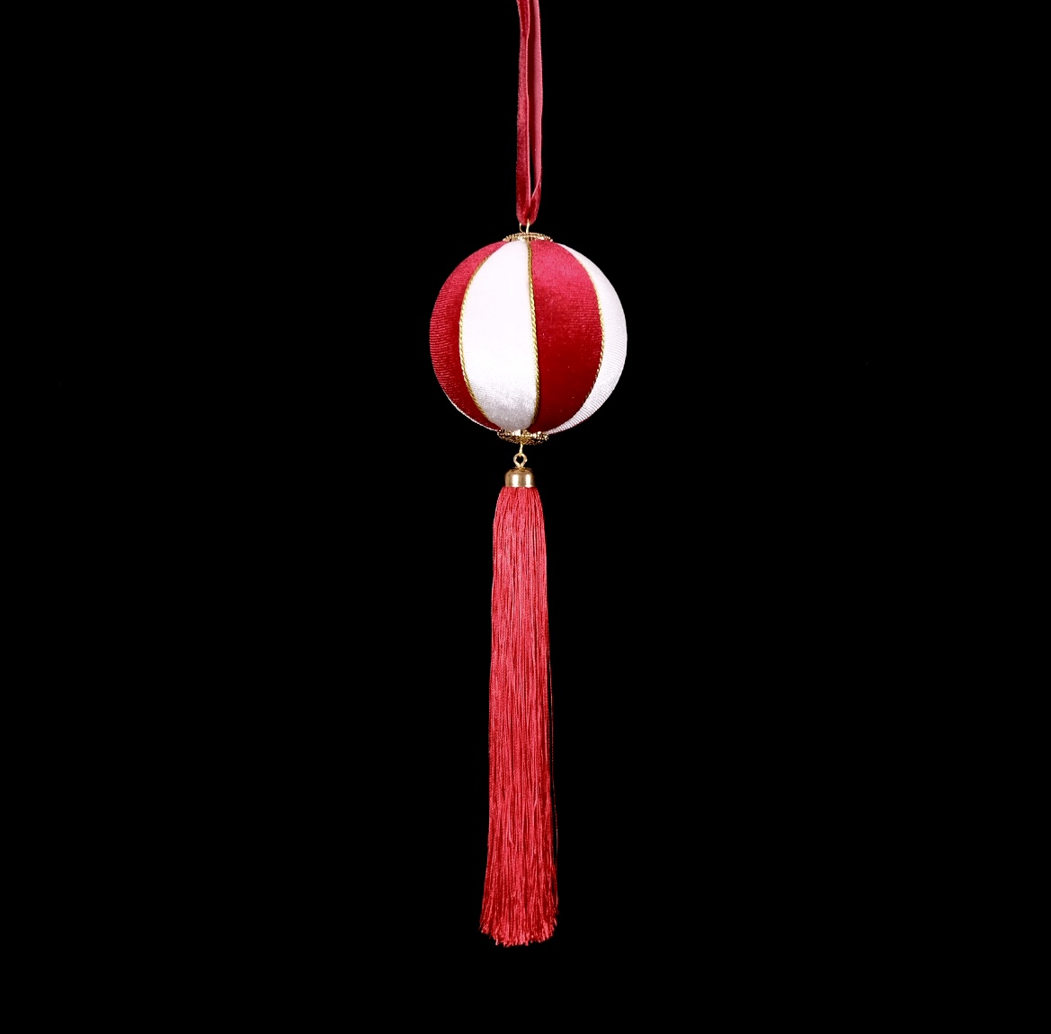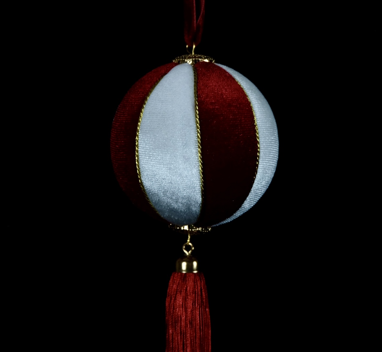Роскошная новогодняя подвеска станет настоящим украшением вашего дома! Авторская работа, выполненная вручную, сочетает в себе элегантность и изысканность. Шар диаметром 7 см обтянут бархатом, создавая эффектный контраст между красно-белыми секторами. Кисточка красного цвета добавляет завершающий штрих, подчеркивая праздничное настроение.