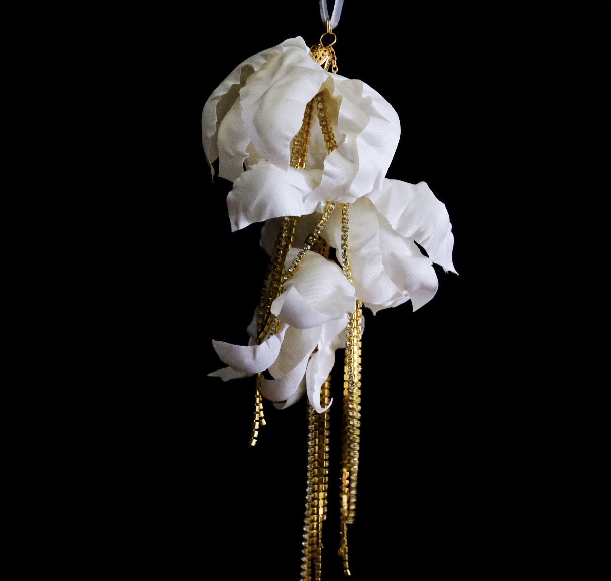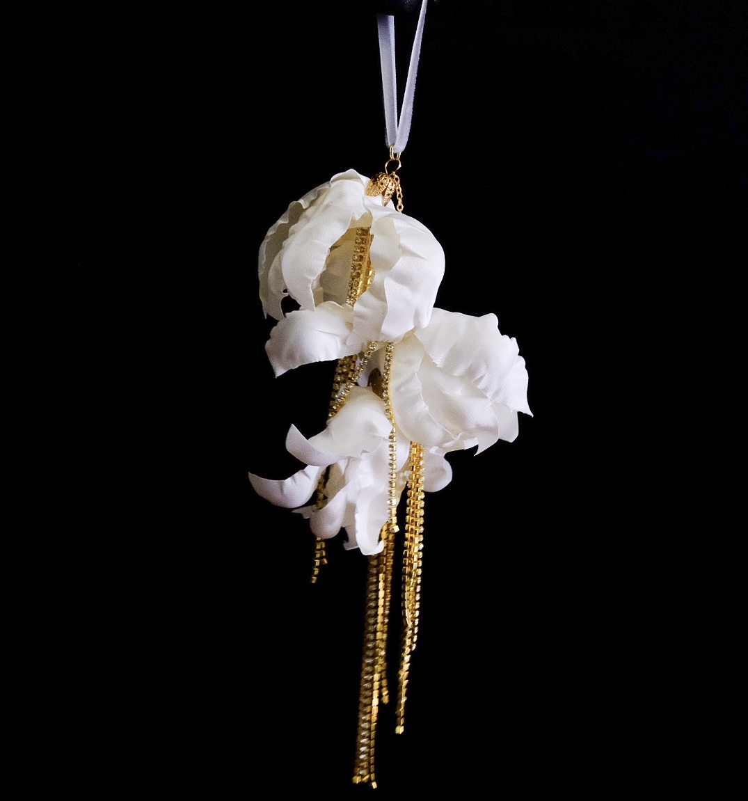 Подвеска из трёх сливочных цветов с сияющими золотыми цепочками от студии новогоднего дизайна ELIT-DECO — настоящее воплощение праздничного настроения и утончённого вкуса. Ручная работа мастера придаёт изделию уникальность и особую энергетику. Нежные сливочные тона создают уютную атмосферу, идеально сочетаясь с мягким блеском золотых элементов. Бархатная петелька позволяет аккуратно разместить изделие на веточке ёлки, подчёркивая внимание к деталям.