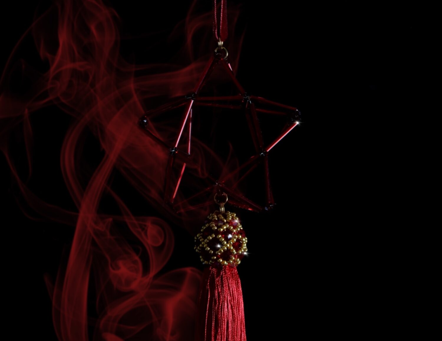 Роскошная подвеска в форме звезды станет настоящим украшением вашего интерьера в преддверии новогодних праздников. Изготовленная вручную из чешского бисера, стекляруса и стеклянных бусин, она переливается всеми оттенками красного и золотого, создавая атмосферу волшебства и уюта. Шелковые нити добавляют изделию изысканности и легкости.