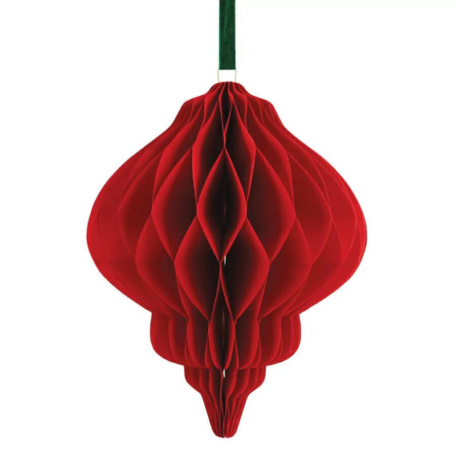 Вытянутое подвесное украшение высотой 20 см создано, чтобы добавить в новогодний декор чуть больше изящества. Стройный силуэт в форме капли и объёмная структура «соты» в насыщенном красном цвете напоминают старинные стеклянные игрушки, но выполнены из лёгкого и прочного материала.