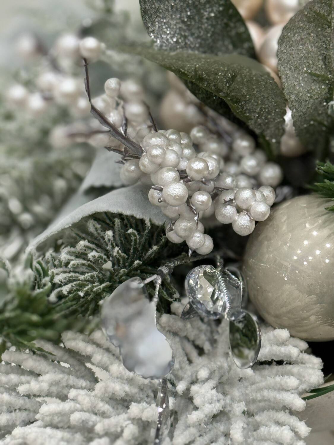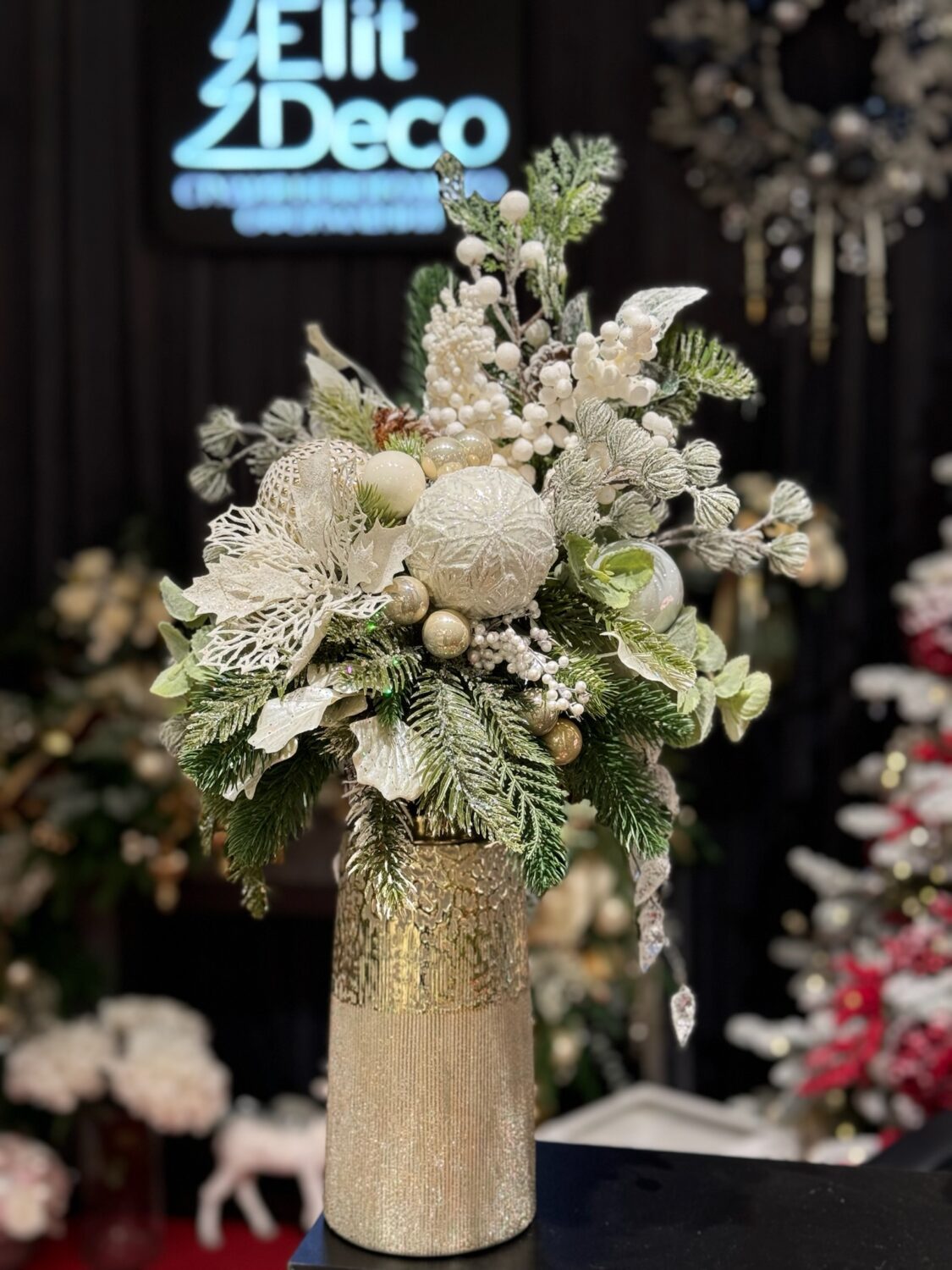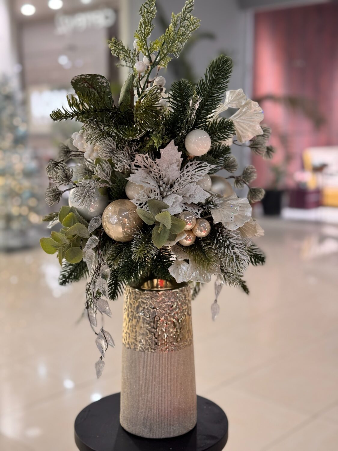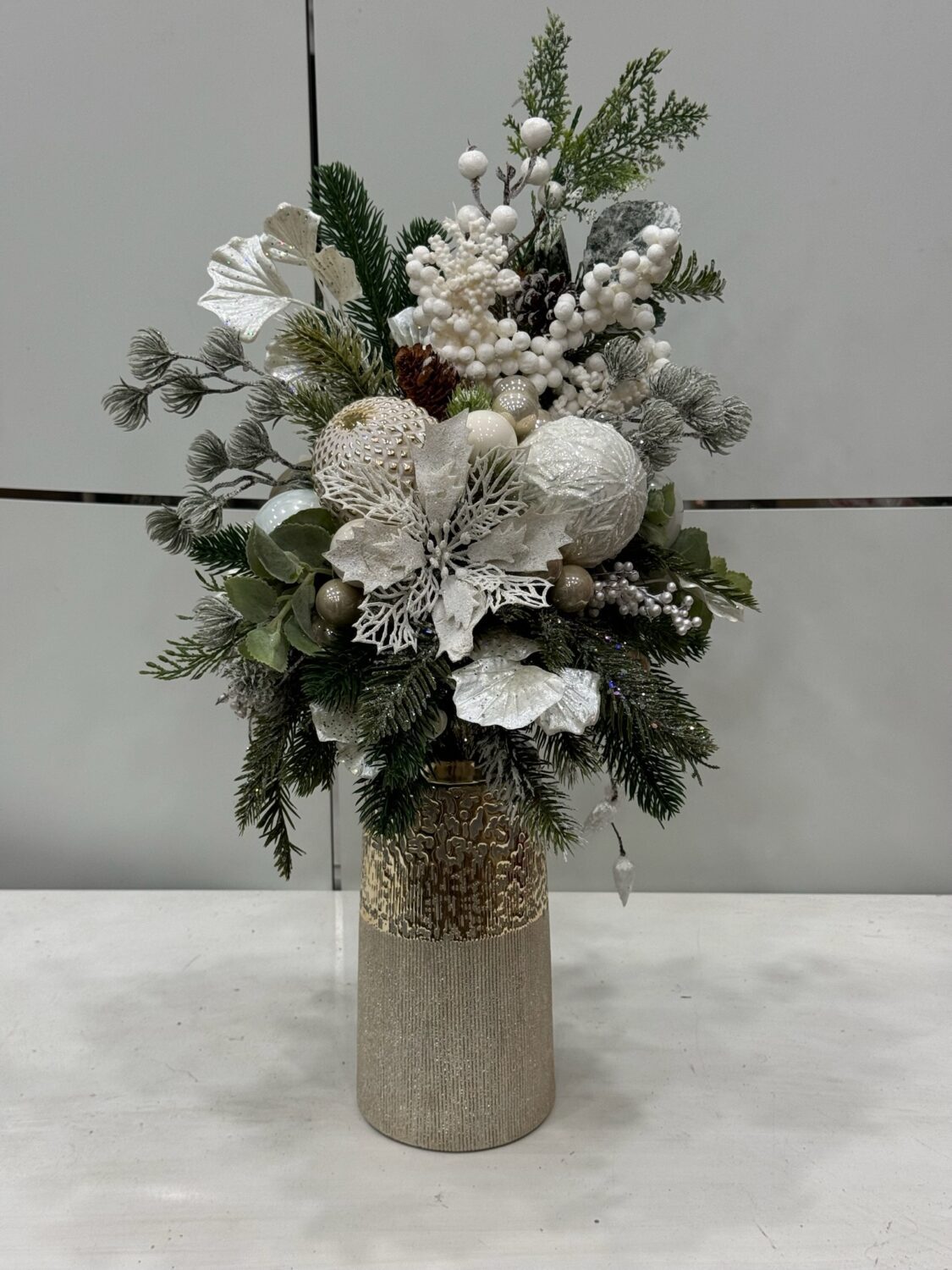 Студия новогоднего дизайна ELIT-DECO представляет высокую новогоднюю композицию в вазе, украшенной изысканной золотой резной полоской. Эта композиция станет настоящим украшением вашего дома или офиса в новогодние праздники. В ней гармонично сочетаются еловые ветки, веточки с белыми ягодами, большие цветы и новогодние шары. Все элементы композиции подобраны с любовью и вниманием к деталям, что создает атмосферу уюта и праздника. Золотая резная полоска на вазе добавляет композиции элегантности и изысканности, делая её настоящим произведением искусства.