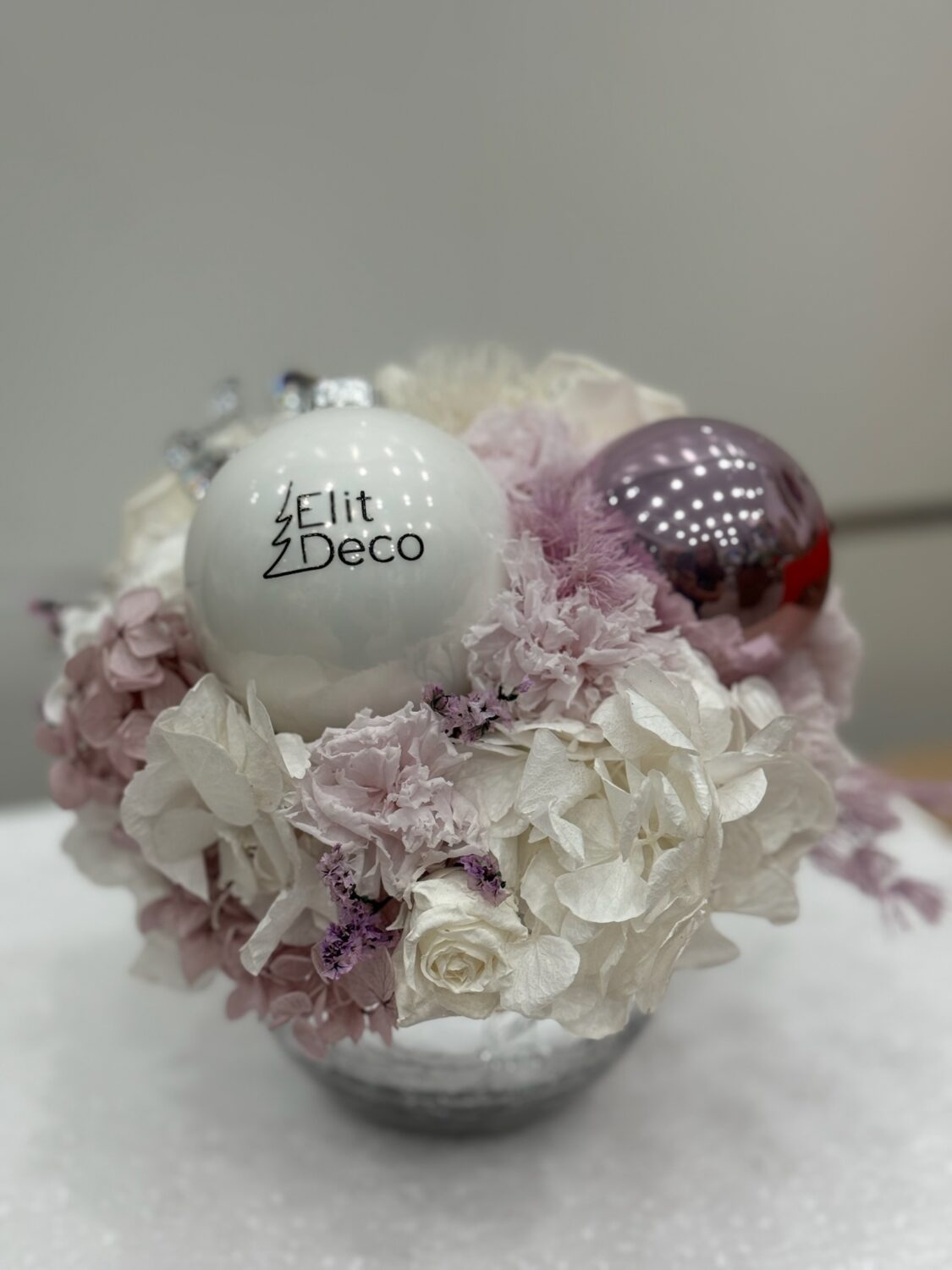 Студия новогоднего дизайна ELIT-DECO представляет уникальную новогоднюю композицию в круглой вазе из стабилизированных цветов и шаров. Ваза выполнена в элегантном серебристом цвете, что придает ей изысканный вид. Композиция включает в себя гортензию, розы и гвоздику, все цветы стабилизированные, что обеспечивает их долговечность и красоту на долгие годы. В верхней части композиции расположены елочные шары, которые добавляют праздничного настроения. Эта композиция станет идеальным украшением для вашего дома или офиса в новогодние праздники.