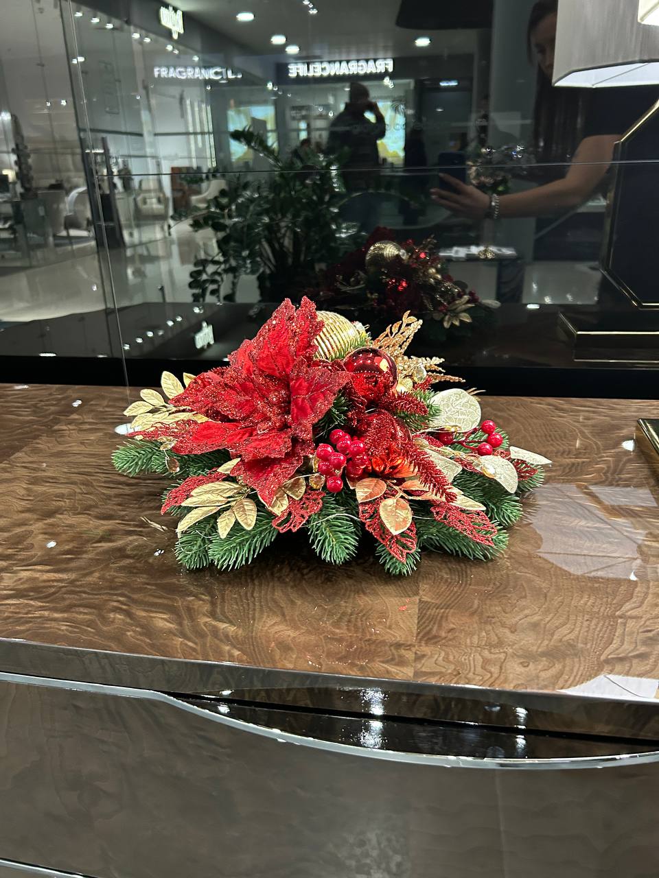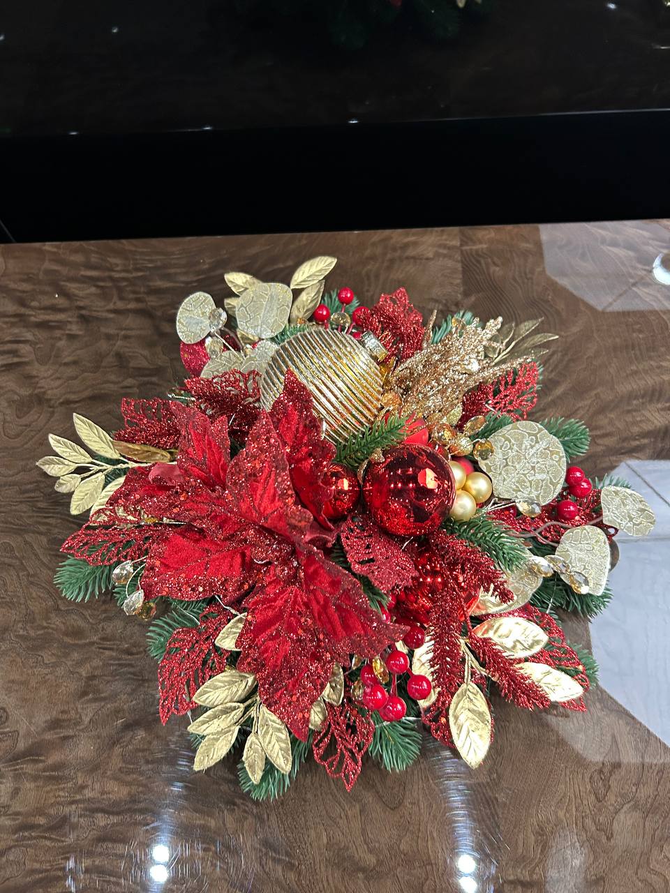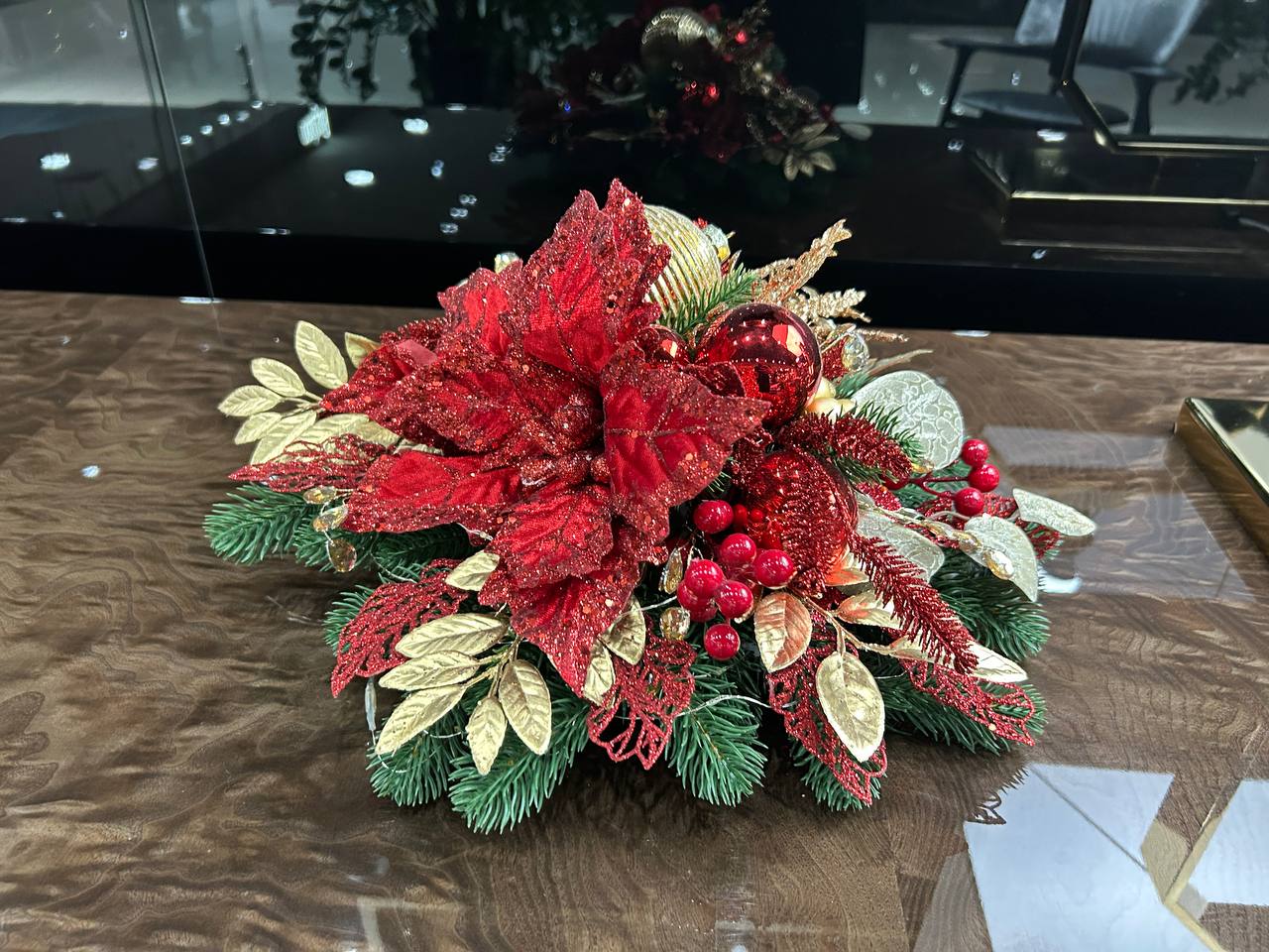 Элегантная настольная композиция из декоративной хвои в красно-золотых тонах. Ярко красные элементы цветок, шары – делают композицию непревзойденной. Идеальный вариант для украшения интерьера, ресторанного столика или гостиничного номера. Такой элегантный элемент декора создаст атмосферу и задаст настроение праздника. Единый гармоничный образ для уютного зимнего вечера от дизайнеров Elit Deco.