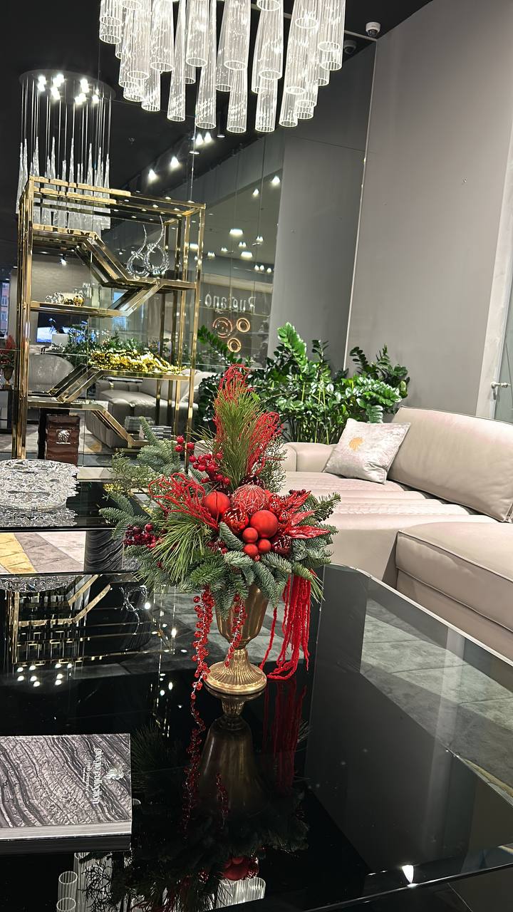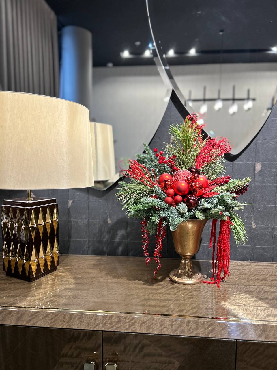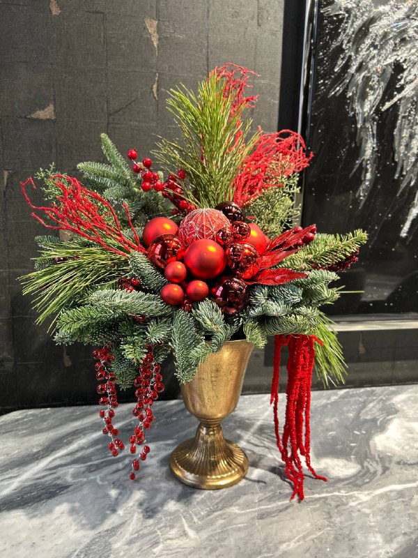 Изящная настольная композиция из сосновых и веточек нобилиса, а также ярко красных декоративных элементов, шаров и листочков. Идеальный вариант для украшения интерьера, ресторанного столика или гостиничного номера. Такой элегантный элемент декора создаст атмосферу и задаст настроение праздника. Единый гармоничный образ для уютного зимнего вечера.