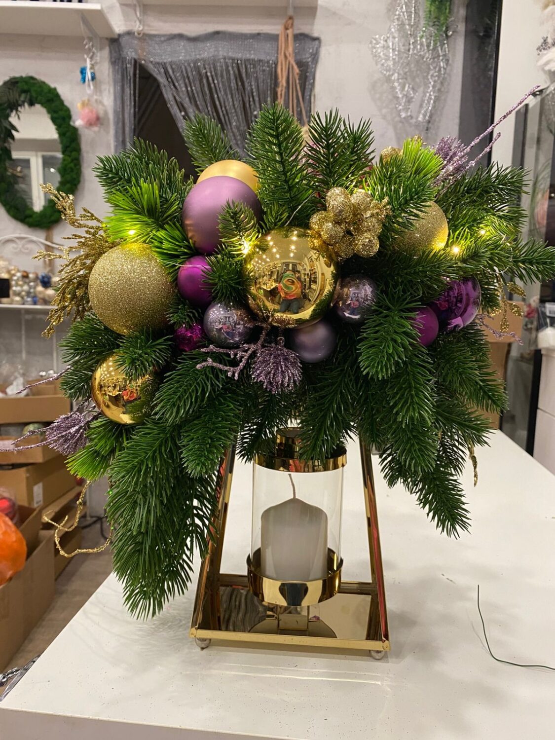 Рождественская композиция “Уютный вечер при свечах” от Elit Deco — это настоящее произведение искусства, которое создаст атмосферу уюта и волшебства в вашем доме. Искусственные веточки ели, украшенные золотыми и сиреневыми шарами разного размера и фактуры, создают ощущение праздника и тепла. Вкрапления золотистых и сиреневых веточек добавляют композиции изысканности и блеска.