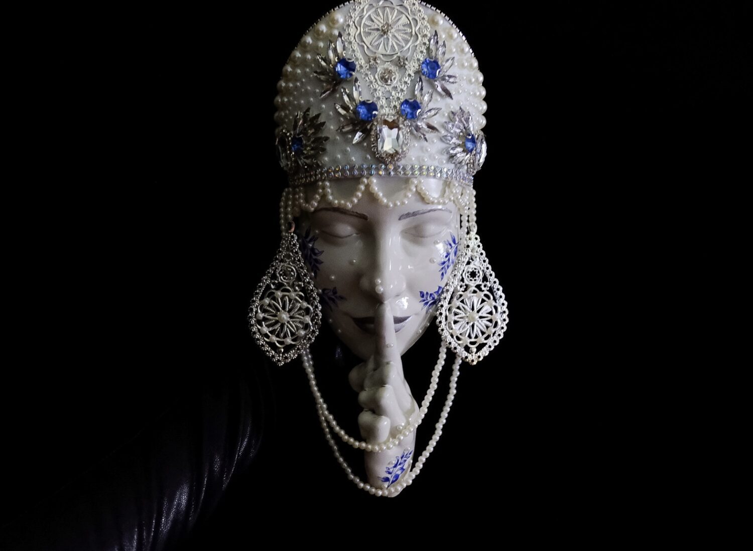 Игрушка изображает Снегурочку в традиционном русском кокошнике, украшенном жемчугом, бисером и декоративными элементами. Кокошник дополнен синими и серебристыми камнями, а также элементами в виде цветов и листьев. Лицо Снегурочки выполнено с закрытыми глазами, что придает ей особую загадочность и очарование.