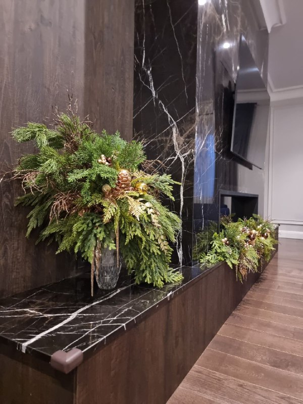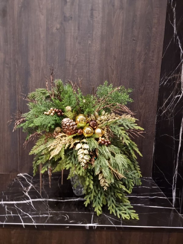 Рождественская композиция Elit Deco — стильное украшение из натуральных веток ели и пихты с декоративными шишками и золотистыми шарами. Такой новогодний декор прекрасно подходит для оформления интерьера дома, офиса, ресепшен или коммерческих пространств. Композиция создаёт атмосферу праздника, наполняет помещение ароматом хвои и становится ярким акцентом новогоднего оформления. Натуральные материалы в сочетании с благородным золотом выглядят эффектно и современно. Композиция также станет отличным подарком на Рождество и Новый год — универсальным, красивым и готовым к установке.