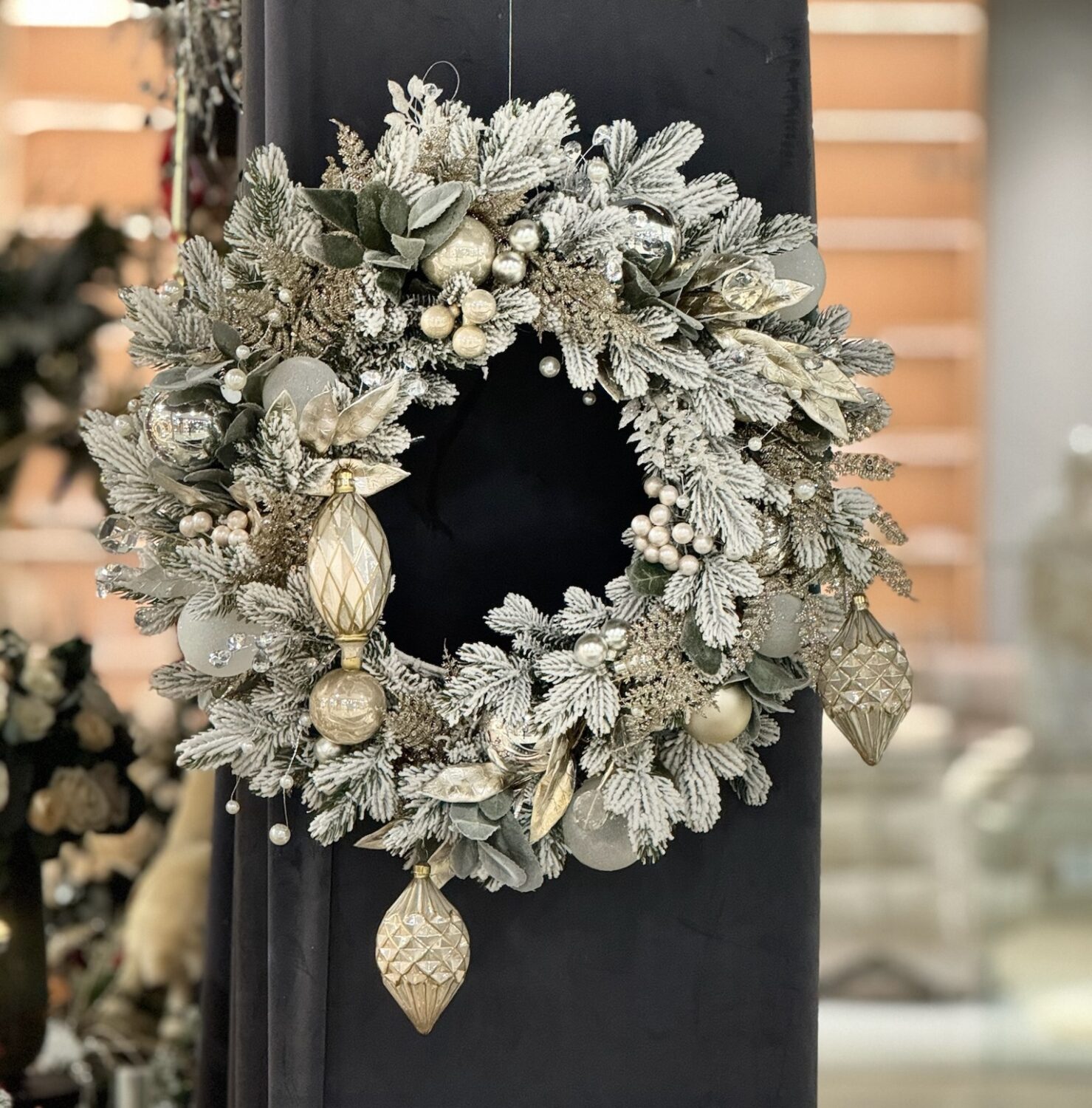 Дизайнеры Elit Deco создали восхитительный рождественский венок Заснеженная шампань с добавлением еловых заснеженных веточек с золотистыми шарами. Шары разнообразной формы и фактуры блестят и переливаются на фоне заснеженной зеленой хвои, выглядит нежно и невероятно воздушно.