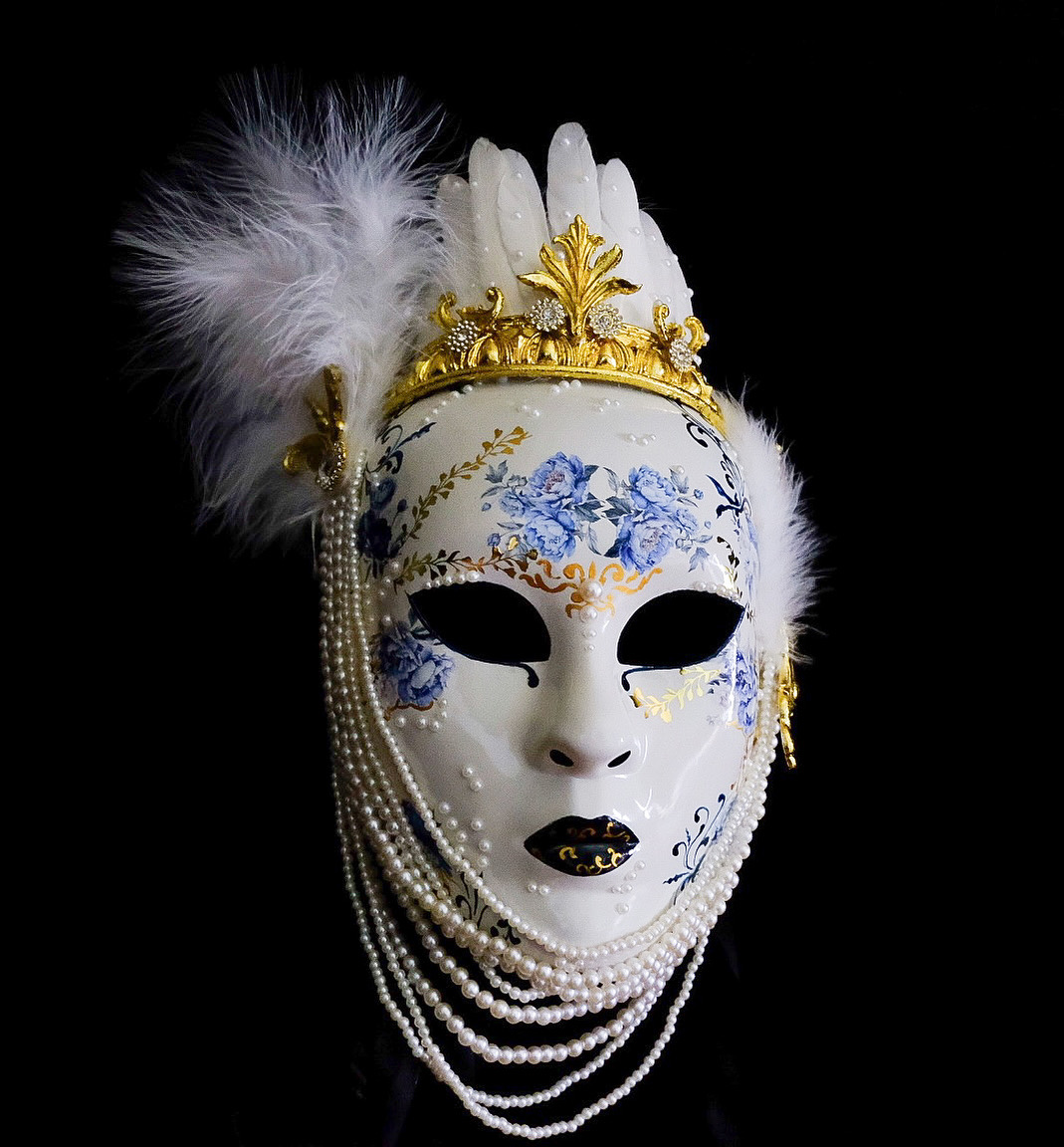 Маска украшена жемчугом, бисером и декоративными элементами, включая голубую и золотую роспись в виде цветов и листьев. Она имеет форму лица с короной на голове и перьями, что придает ей особую загадочность и очарование.